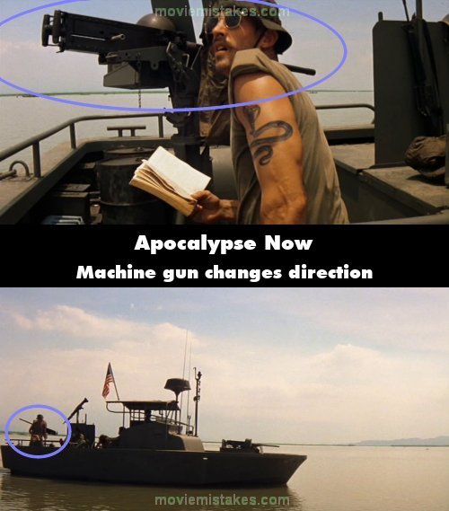 Continuity mistake: After Captain Willard looks at the picture of Colonel Kurtz being decorated by General Westmorland, they're all startled by the "Arc light" B-52 strike, note the rear machine gun is pointing forward and a helmet is hanging from the middle machine gun. In the next shot the rear machine gun is pointing aft and the helmet is now gone. (00:24:05)