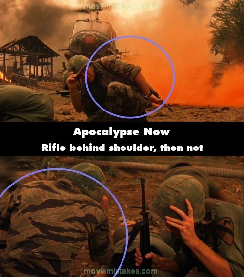 Continuity mistake: When Kilgore's chopper lands, Captain Willard is holding his rifle with the strap around his left shoulder so that the butt comes up above his head. In the next shot he's holding it in his left hand and the strap is not around his shoulder anymore. (00:26:40)