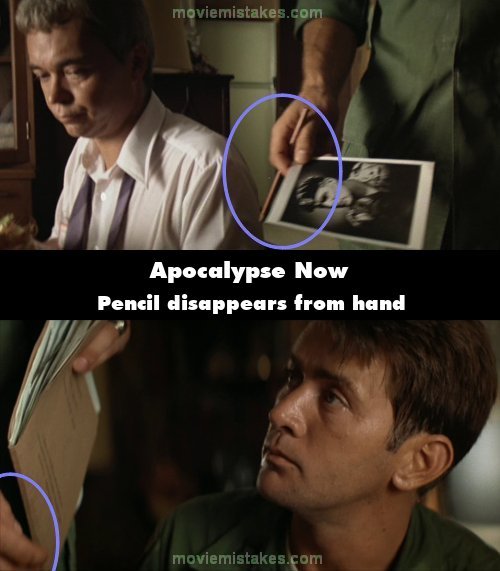 Continuity mistake: At dinner with the general, Harrison Ford walks over to the captain with the picture of Colonel Kurtz and he has a pencil in his right hand. In the next shot as he drops the folder on the floor the pencil is not there. (00:12:25)