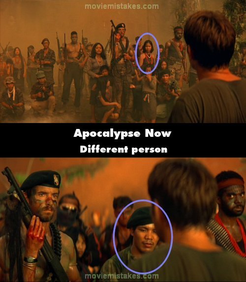 Continuity mistake: As Captain Willard approaches Lieutenant Colby there is a woman standing in the crowd to the right of him. The next time we see him a few seconds later everyone in the shot is standing in the same spot except the woman is gone and a man wearing a green beret appears in her place. (02:32:40)