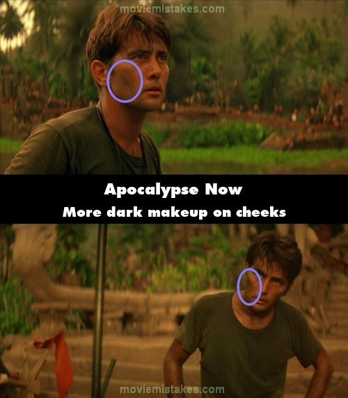 Continuity mistake: After Dennis Hopper comes onto the boat Captain Willard asks him, "Who are all these people?" The Captain has more dark makeup on his cheeks now than he had when they approached the camp a few seconds ago. (02:30:15)