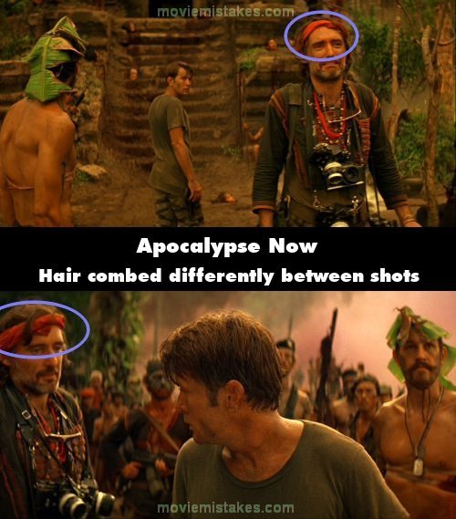 Continuity mistake: As they approach the severed heads Dennis Hopper says, "Wrong, wrong, if you could've heard the man just two days ago". The lock of hair falling over the left side of his bandanna is combed differently between shots. (02:33:35)