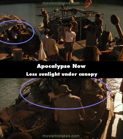 Continuity mistake: As Chef looks over the papers from the sampan crew the woman is standing under the canopy with the sun shining on her. The next time we see her several seconds later she's in the same spot but the sun is no longer shining on her. (01:35:35)