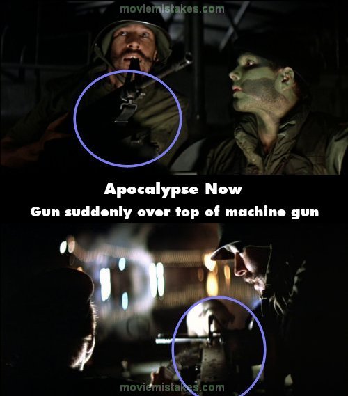 Continuity mistake: As they approach the Do Lung Bridge Chef talks to Lance with his gun muzzle pointing out in front of him. The muzzle isn't near anything but in the next shot it's resting on the flat piece of metal on top of the machine gun. (01:40:35)
