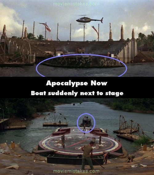 Continuity mistake: The next day as the boat leaves the USO show at Hau Phat to continue up the river we see the battered stage from the back of the boat. The boat passes the stage by about 100 feet but in the next shot its back right next to the stage. (01:11:25)