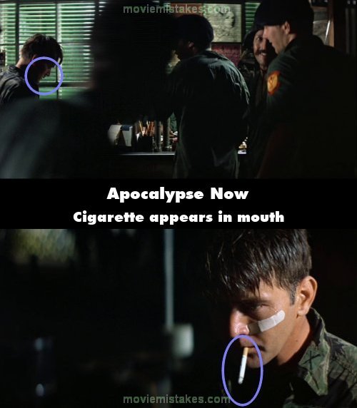 Continuity mistake: Just after Captain Willard grabs the sergeant by the throat his cigarette appears back in his mouth between shots, than disappears again in the next shot as he walks away. (01:05:40)