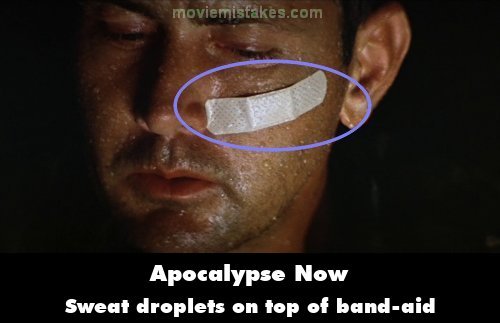 Revealing mistake: In a close-up of Captain Willard's face as he reads about Kurtz' "Operation Archangel" the sweat droplets on the band-aid are exactly the same as the droplets on his skin. The droplets were obviously sprayed on his face as Band-aids don't sweat. (01:02:50)