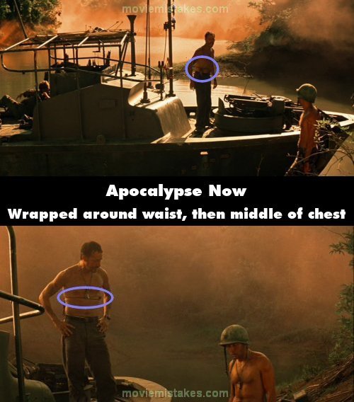 Continuity mistake: Chef says to Captain Willard, "I thought you were going in to blow up a bridge or some railroad tracks or something" and he has something strapped around his waist. He never touches it but ten seconds later when we see him again it's strapped across the middle of his chest. (02:24:30)