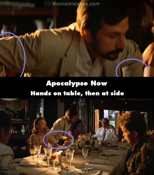 Continuity mistake: Hubert has a discussion with the Frenchmen sitting to the right of Roxanne who gets up and leaves. As he gets up his hands are on table but in the next shot they're at his sides. (02:11:05)