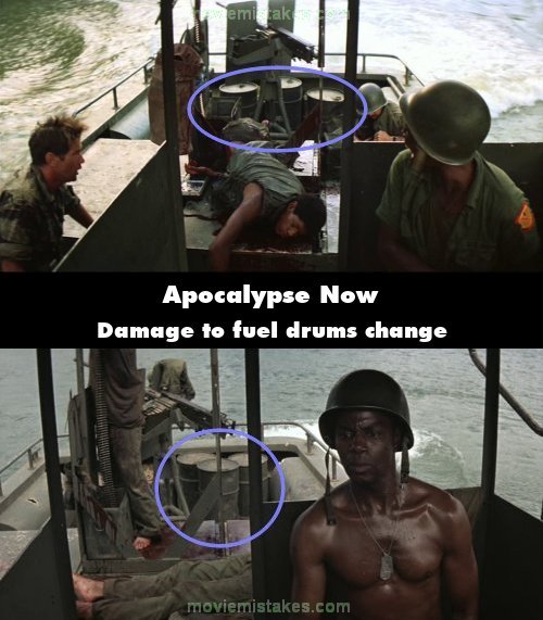 Continuity mistake: As they approached the French plantation the partially crushed fuel drum on the back the PBR that we saw after Clean was shot, has been replaced with one that is only slightly dented. (01:56:15)