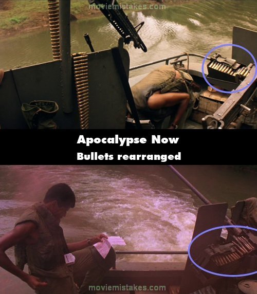 Continuity mistake: When Clean sits down in the back of the boat and opens up the tape from his mom, notice the order of the bullets in the machine gun to the right of the screen. When we first see them they're all packed in order, three shots later as he reads the letter they're uneven though no one has touched them. (01:51:00)