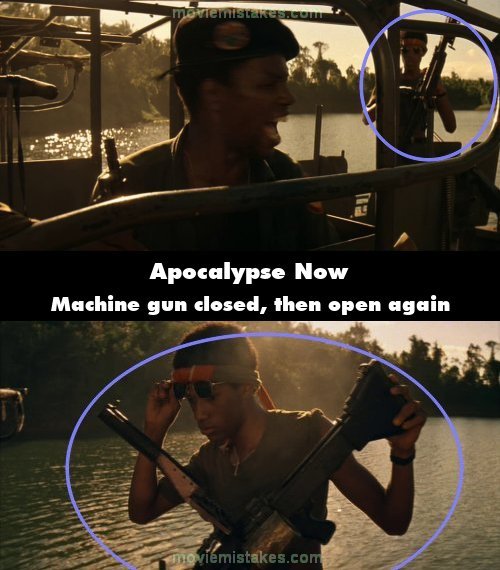 Continuity mistake: After shooting up the sampan Clean closes his machine gun twice between shots. (01:37:15)