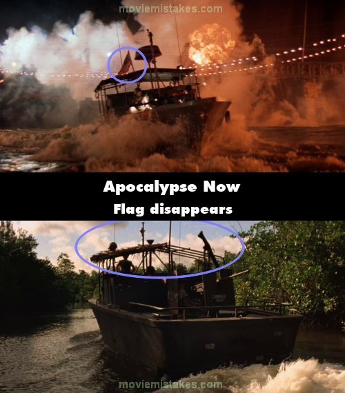 Continuity mistake: When they leave the Do Lung Bridge the flag is visible on the roof of the boat, but several seconds later at the beginning of the next scene, it's gone. (01:48:45)