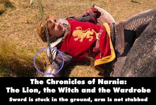 Revealing mistake: During the battle scene, the White Witch clearly stabs Peter in the arm with her sword. In the very next shot the sword goes through the chainmail behind his arm, into the ground. (02:02:40)