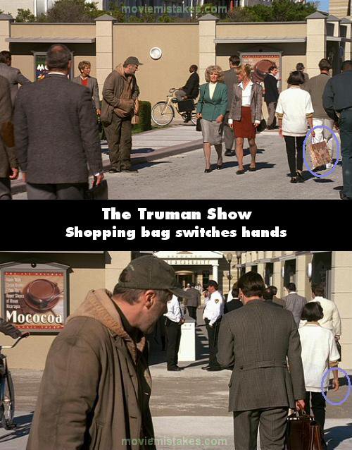 Continuity mistake: In the scene just before Truman sees his dad as a homeless man, there is a woman in a white sweater holding a shopping bag in her right hand. When Truman turns, the bag switches to her left. (00:15:05)