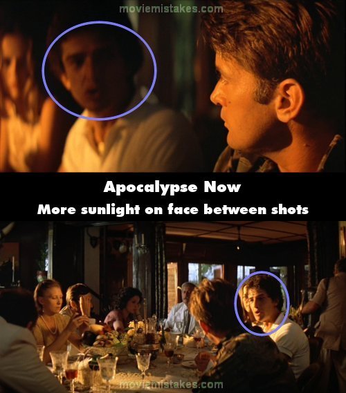 Continuity mistake: At dinner, the Frenchmen sitting to the right of Captain Willard says, "Why don't you Americans learn from us, from our mistakes?" When he says this there's a shadow falling on his face but in the next shot his face is lit up again by the sun. (02:10:10)