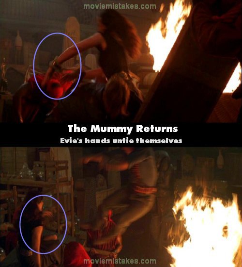 Continuity mistake: When Rick jumps over the fire to save Evie in the museum, her arms are tied together. The instant he hits the board and the camera is at another angle, her arms are free. Then when she falls over his shoulder, they are bound again. (00:38:50)