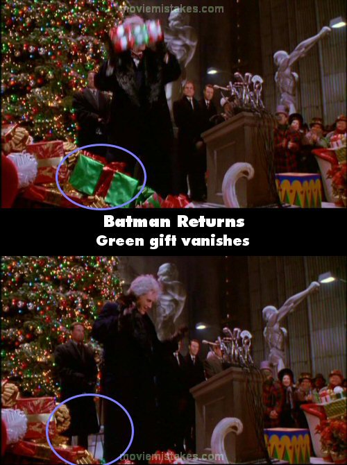 Continuity mistake: After Max Schrek throws some of the presents out to the crowd, when it cuts back, between shots a large green present on the top of the pile vanishes. (00:09:55)