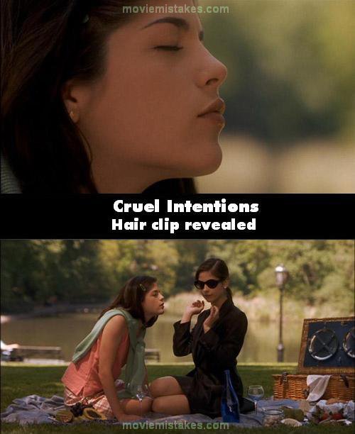 Continuity mistake: In the scene where Kathryn teaches Cecile how to kiss, the green clip in Cecile's hair keeps changing from almost fully covered by her hair to visible, throughout the scene. (00:22:30)