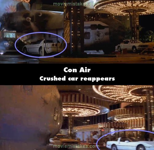 Continuity mistake: When the plane is crashing into the hotel, it crashes into a white corvette. Then it cuts to another scene, then it cuts to back outside, and you see the plane crash into the corvette again, from a different angle. Then it does the same thing 2 more times, until the plane is actually stopped. After it cuts to another scene outside, you see the same corvette, with only a flaming piece of metal on the hood, not completely shattered like it should be. (01:37:30)