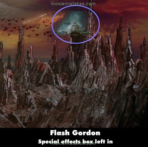 Revealing mistake: Just after Vultan evacuates War Rocket Ajax leaving Flash on board, there is a shot of the rocket heading towards the camera. There is a green-tinted box surrounding it that the special effects team forgot to remove, after it had been rendered against the background. (01:36:05)
