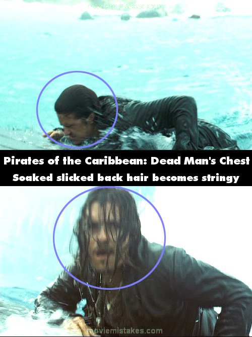 Continuity mistake: After the ship with the "bride spirit" is attacked by the Kraken, Will ends up underwater, and when he surfaces his hair is soaked and slicked back, as he climbs on the ship's debris. However, in the next shot, his hair is parted, stringy and falling to the front. (01:33:50)