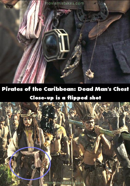 Deliberate mistake: When Will is bound and brought before "Chief" Jack, Will says, "The compass!" and there is a close-up of the compass, as it hangs to the right of the long striped cloth. However, in all other shots the compass hangs to the left of the red and white striped cloth. This is a flipped shot - note the large buckles. (00:24:00)