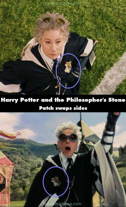 Continuity mistake: In the Quidditch scene, when Madame Hooch steps onto the field she says, "Now I want a nice, clean game," and while she's looking up, her Hogwarts patch is on the left side of her robes. At the end of the Quidditch game when she says, "Gryffindor wins," her patch is on the right side of her robes. Interestingly, the shot of Madame Hooch is a flipped shot, yet it was pasted onto the scenic background, which is not flipped, but properly positioned. (01:23:00)
