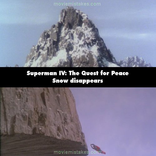 Continuity mistake: In a split second, all of the snow on the mountain cut by Superman disappears.