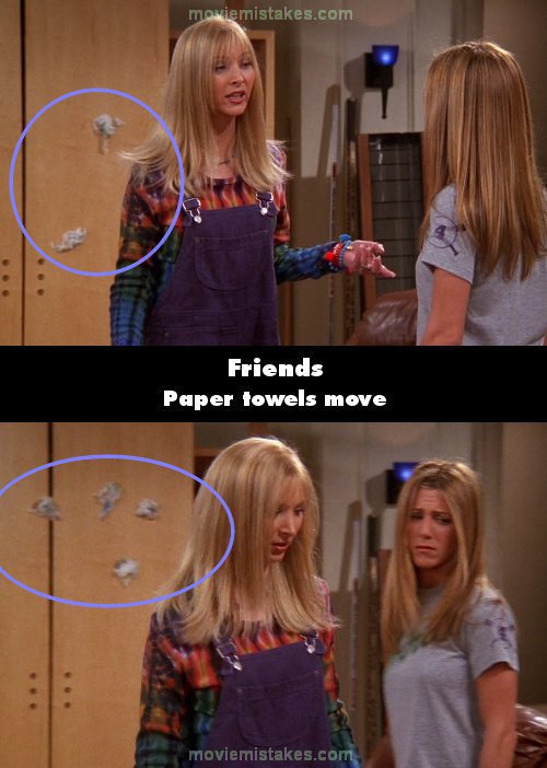 Continuity mistake: When Rachel and Joey are at Joey's apartment throwing wet paper towels at the entertainment unit, Phoebe comes in to ask Rachel to switch back to Monica's apartment. During the scene, Phoebe is standing in front of the entertainment unit, and the wet paper towels' number and positions change between shots. (00:18:10)