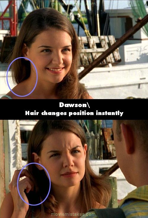 Continuity mistake: When Joey and Pacey are talking on the dock just after arriving back in Capeside, Joey's hair changes instantly from being swept behind her right shoulder and behind her back, to sitting in front of both shoulders.