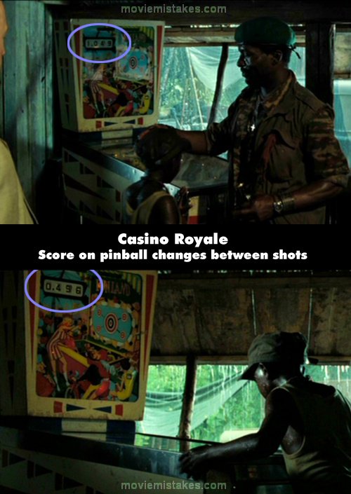 Continuity mistake: In the Ugandan freedom fighter's hut, the commander is playing pinball when Le Chiffre arrives. His game score clicks over to 1049 as he hands the machine to a young boy. In the next shot of the boy playing the score is somewhere in the 500's only. (00:06:55)
