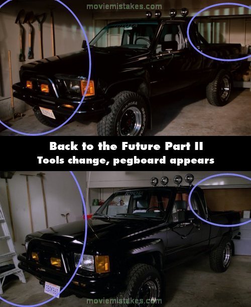 Continuity mistake: The garage where Marty's truck is parked is very different in the opening scene of BTTF II than in BTTF I. The gardening tools on the wall to the left were different, and the brown wall siding in the back of the garage was not there in Part I. (00:00:38)