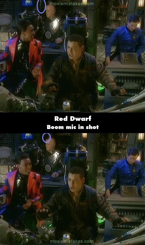 Visible crew/equipment: When the Cat becomes visible again after going through an unreality pocket, the shot changes to a wide shot of the crew. A boom mic can be seen to be pulled out of shot at the top of the screen by Kryten's head. (00:11:40)