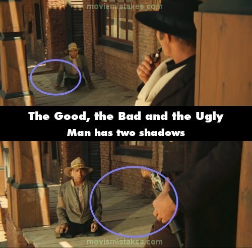 Revealing mistake: When Angel Eyes has finished paying the legless man for information, the legless man hops into the saloon. Notice he has two shadows, revealing the presence of stage lighting. (00:25:08)
