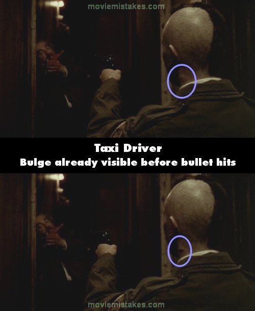 Visible crew/equipment: Right before De Niro's character is shot in the neck, you can see the small charge used to detonate the blood. (01:39:50)