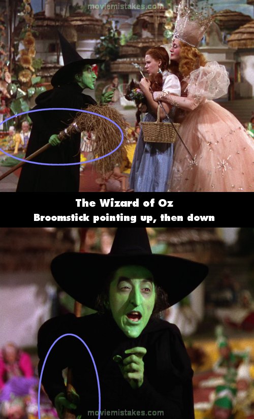 Continuity mistake: Just before the Wicked Witch leaves Munchkinland she says to Dorothy, "just try to stay out of my way" and her broomstick is facing upwards. In the next shot it's facing downwards. (00:30:35)