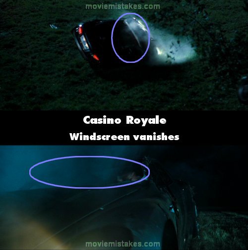 Continuity mistake: At the end of the scene where Bond rolls the Aston Martin, during the wide shot just as the car finishes the last roll, the windshield is still on the car. In fact you can see the windshield fall back into a "normal" position. However, when the shot changes to the close-up of Bond in the car the windshield is no longer there. (01:46:40)