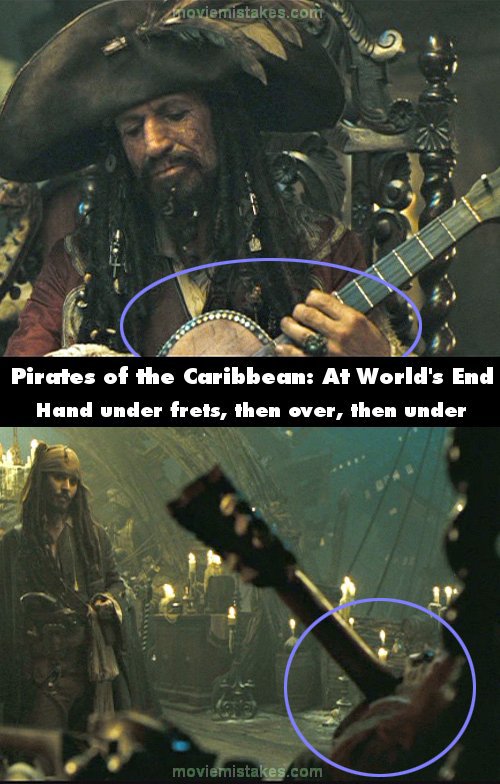 Continuity mistake: When Jack begins to speak to Captain Teague, Teague's left hand is under the guitar frets, but in the shot facing Jack that hand rests atop the guitar, then when Teague says, "It's not just about living forever, Jackie," his left hand is under the frets again.