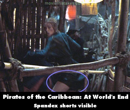 Revealing mistake: After the military attack Sao Feng's residence, when Elizabeth is seen fighting amid the melee the black spandex-like shorts are visible under her robe as she kicks up.