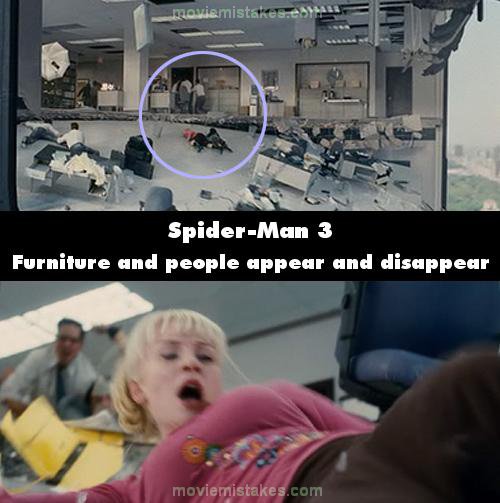 Continuity mistake: When the office floor collapses, Gwen and a girl in green are struggling not to fall down. In a close-up, one second later, the girl is replaced by a chair. She can be seen several meters away, next to a guy who magically appeared on scene.