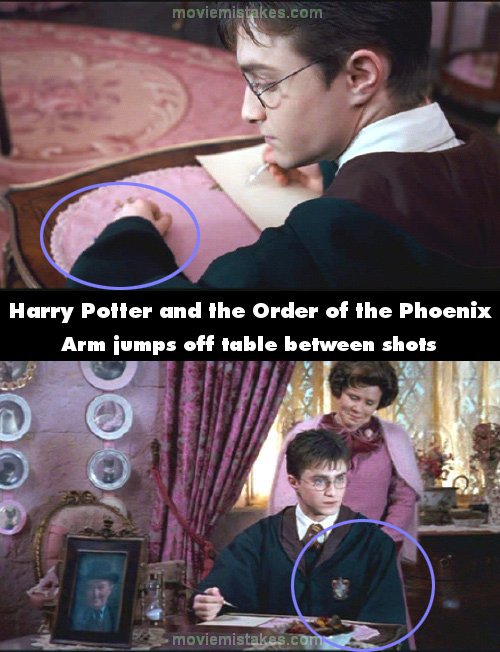 Continuity mistake: During Harry's first detention, before he starts writing and while Umbridge is still talking, he's sitting at the desk. He's holding the quill in his right hand, and his left hand and arm are resting on the desk. The shot switches to another angle, and his left arm is immediately off the desk. Umbridge is still talking, so there is no time lapse between the two shots. (00:37:10)