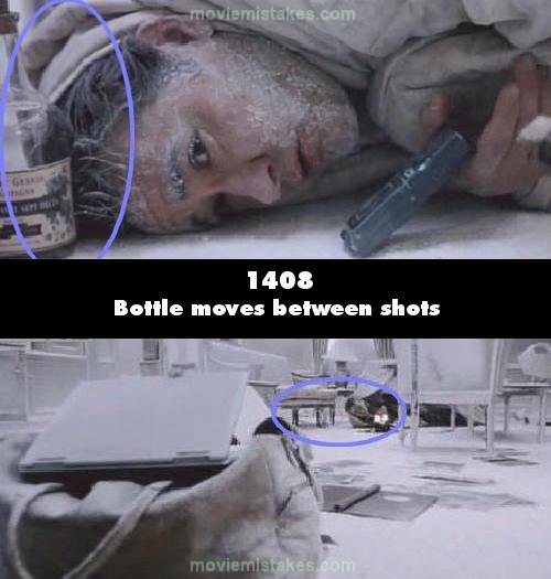 Continuity mistake: In the scene Where Mike Eslin's hotel room has frozen over and he is laying on the floor talking into his recorder he notices his computer turns on and his wife is talking to him. As Mike tries to get up you see his head touch the alcohol bottle, in the next shot that is further away from Mike you see the bottle is much further away from his head then it should be.