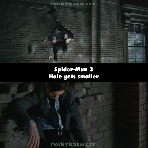 Continuity mistake: When Peter is thrown against a brick wall, he produces a big hole around his left shoulder. In the close-up the hole is smaller.