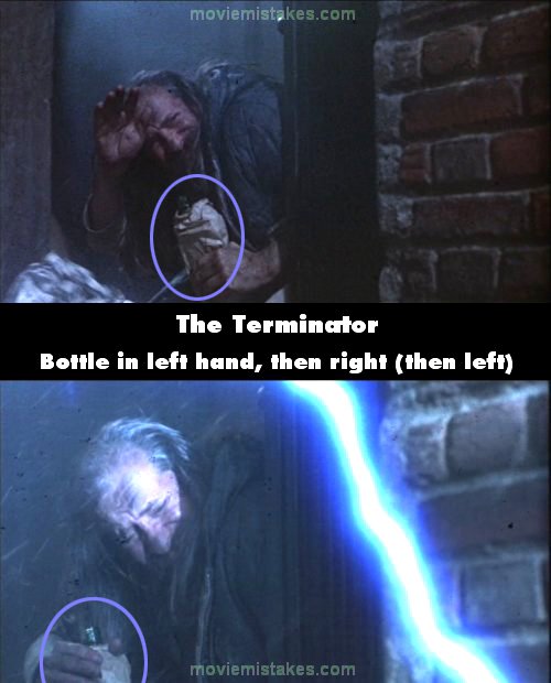 Continuity mistake: At the start of the film when we first see Reese arriving, the drunk homeless guy is holding a bottle in his left hand, then the camera continuously switches between Reese's arrival and the old guy, in these shots, the bottle keeps changing hands from left to right, then back to left. (00:06:40)