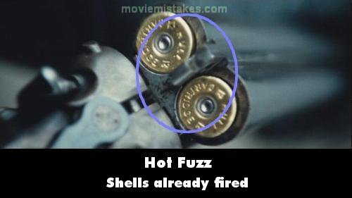 Revealing mistake: When the officer holding the double barrel shotgun has it broken open to reload it, you can see that the primers have been dimpled, meaning that they've been fired. The rifle is closed up again without the spent shells being replaced. (01:41:10)