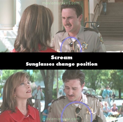 Continuity mistake: As Gale is talking to Dewey outside the school, when she is trying to get information from him about the killings, Dewey takes his sunglasses off and hangs them on his shirt. In the following scene they hang two different ways every time the camera cuts to him. (00:48:40)