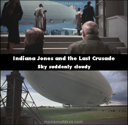 Continuity mistake: The sky colour/condition changes between the shots of Indy and his father in line to get on board the Zeppelin and the scene just before. In one, it is cloudy, and in the other it is a clear blue.