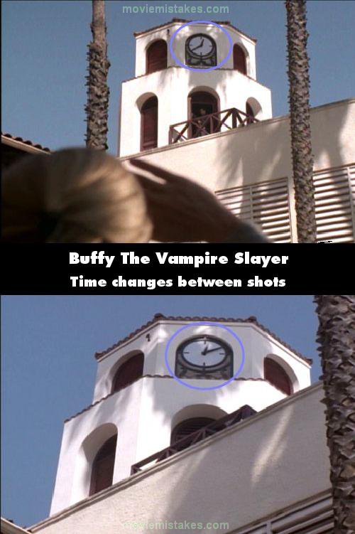 Continuity mistake: The time on the clock, when Buffy spots Jonathan, changes dramatically between shots.