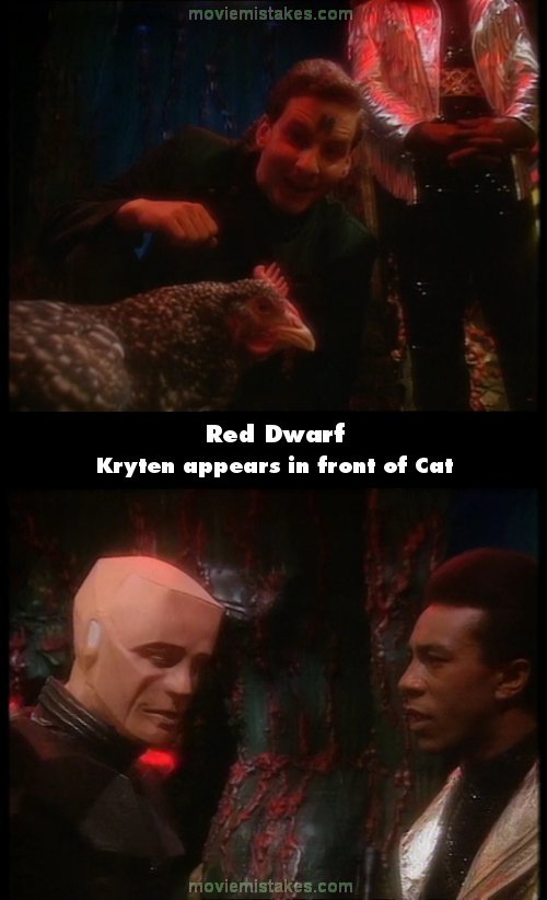 Continuity mistake: When Rimmer taunts Lister as a chicken, the Cat is stood next to him facing the camera with no one else near him. In the next shot Kryten has appeared standing right in front of the Cat. (00:08:00)